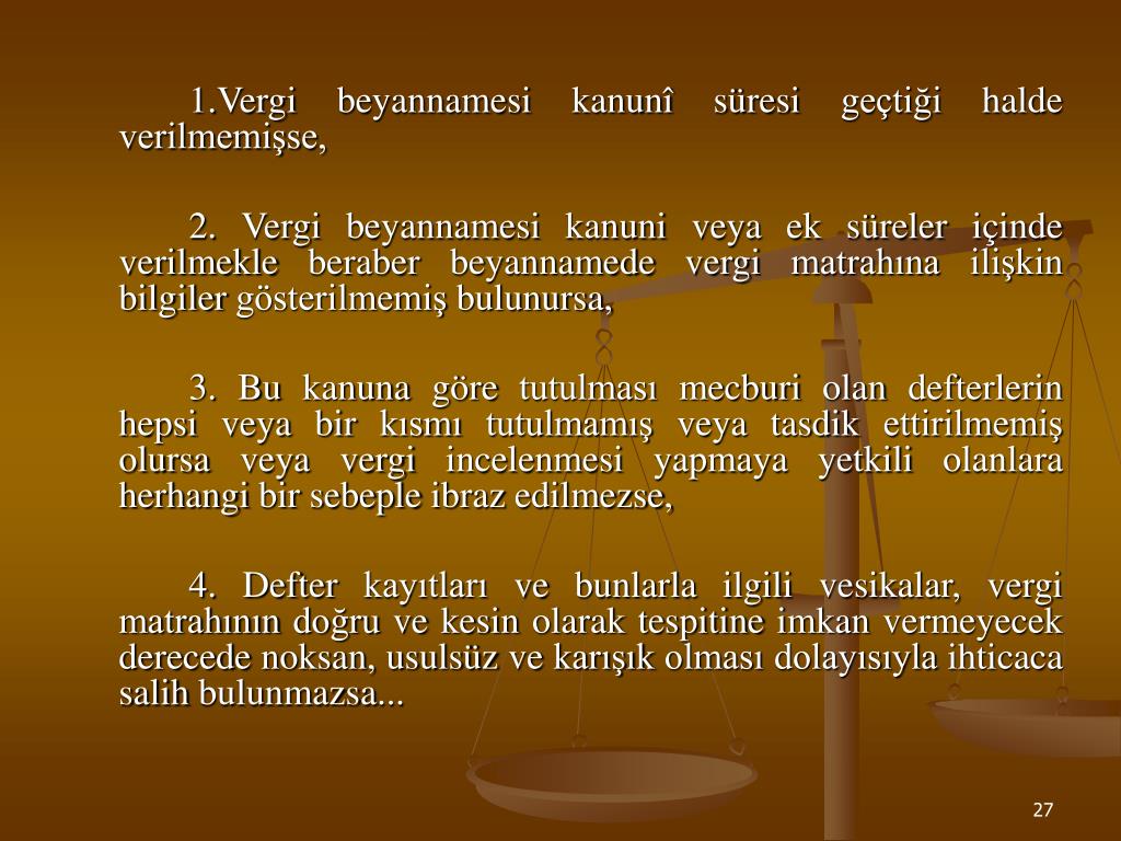 1.Vergi beyannamesi kanunî süresi geçtiği halde verilmemişse, 2. Vergi beyannamesi kanuni veya ek süreler içinde verilmekle beraber beyannamede vergi matrahına ilişkin bilgiler gösterilmemiş bulunursa, 3. Bu kanuna göre tutulması mecburi olan defterlerin hepsi veya bir kısmı tutulmamış veya tasdik ettirilmemiş olursa veya vergi incelenmesi yapmaya yetkili olanlara herhangi bir sebeple ibraz edilmezse, 4. Defter kayıtları ve bunlarla ilgili vesikalar, vergi matrahının doğru ve kesin olarak tespitine imkan vermeyecek derecede noksan, usulsüz ve karışık olması dolayısıyla ihticaca salih bulunmazsa...