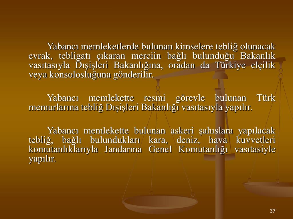 Yabancı Memlekette Bulunanlara Tebliğ (97) Yabancı memlekette bulunanlara tebliğ o memleketin yetkili makamı vasıtasiyle yapılır. Bunun için anlaşma varsa veya o memleketin kanunları müsait ise o yerdeki Türk siyasi memuru veya konsolosu tebliğin yapılmasını yetkili makamdan ister. Kendisine tebliğ yapılacak kişi Türk vatandaşı ise, tebliğ Türk siyasi memuru veya konsolosu vasıtasiyle de yapılabilir.