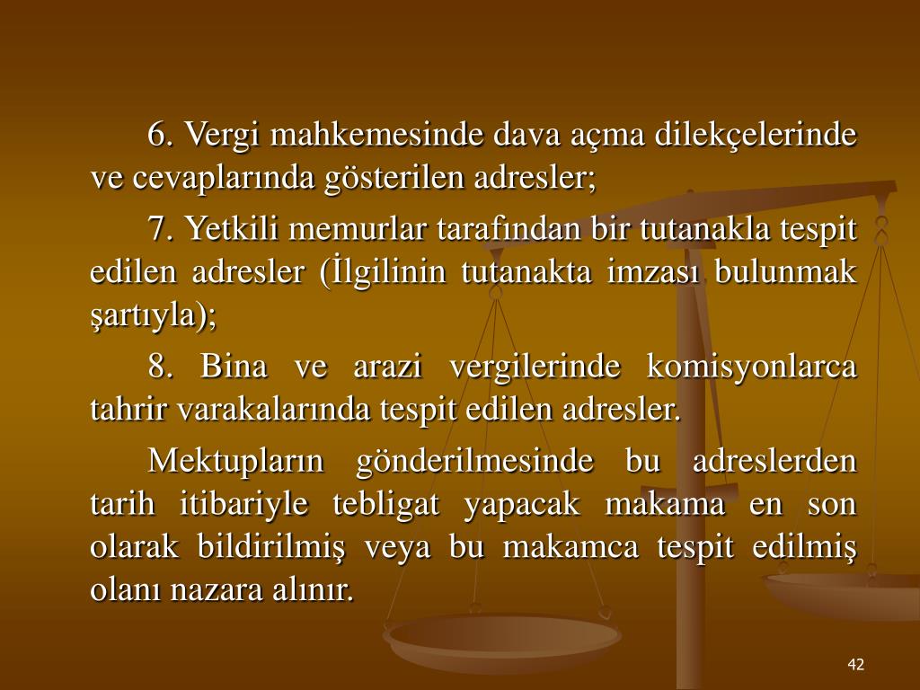 6. Vergi mahkemesinde dava açma dilekçelerinde ve cevaplarında gösterilen adresler; 7. Yetkili memurlar tarafından bir tutanakla tespit edilen adresler (İlgilinin tutanakta imzası bulunmak şartıyla); 8. Bina ve arazi vergilerinde komisyonlarca tahrir varakalarında tespit edilen adresler. Mektupların gönderilmesinde bu adreslerden tarih itibariyle tebligat yapacak makama en son olarak bildirilmiş veya bu makamca tespit edilmiş olanı nazara alınır.