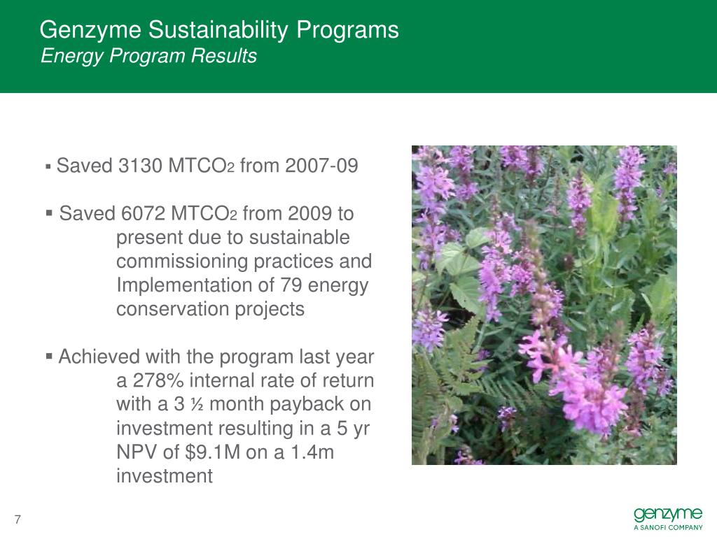 Genzyme Sustainability Programs Linking energy management to asset care and reliability • Why take an integrated approach to energy, asset care and reliability? • Gain efficiency through articulation of common program attributes • Ensure continuous improvement of all our programs • Deliver highest level of value to our sites • Drive improved reliability • Reduce energy costs • Increase life expectancy of our assets • Reduce impact on our environment