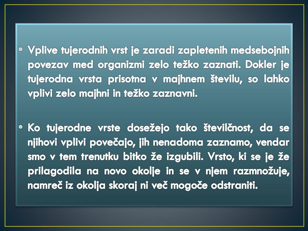 Vplive tujerodnih vrst je zaradi zapletenih medsebojnih povezav med organizmi zelo težko zaznati. Dokler je tujerodna vrsta prisotna v majhnem številu, so lahko vplivi zelo majhni in težko zaznavni. • Ko tujerodne vrste dosežejo tako številčnost, da se njihovi vplivi povečajo, jih nenadoma zaznamo, vendar smo v tem trenutku bitko že izgubili. Vrsto, ki se je že prilagodila na novo okolje in se v njem razmnožuje, namreč iz okolja skoraj ni več mogoče odstraniti.