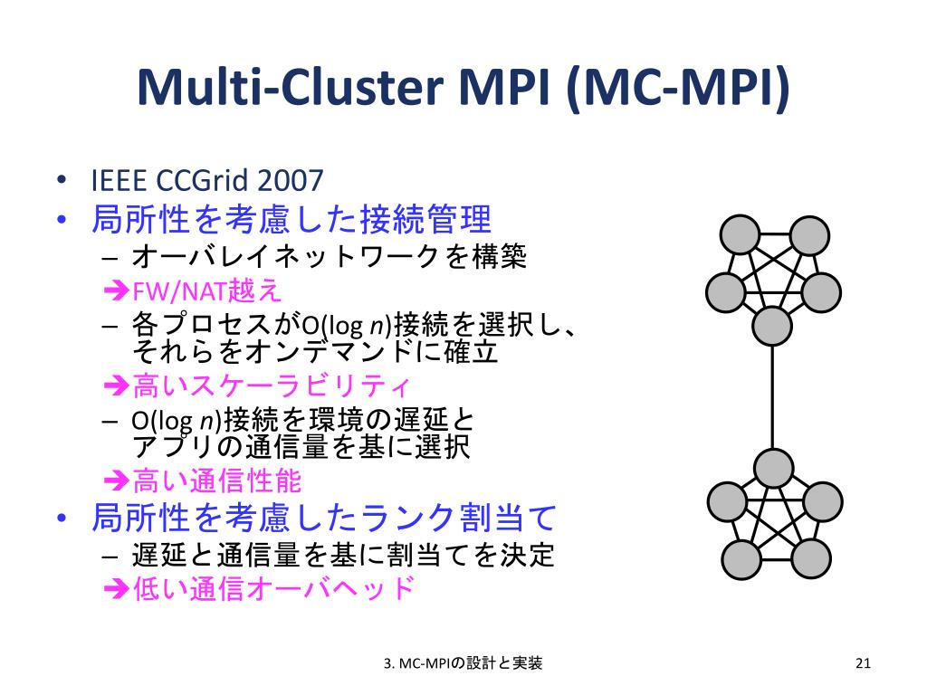 Multi-Cluster MPI (MC-MPI) • IEEE CCGrid 2007 • 局所性を考慮した接続管理 • オーバレイネットワークを構築 FW/NAT越え • 各プロセスがO(logn)接続を選択し、それらをオンデマンドに確立 高いスケーラビリティ • O(logn)接続を環境の遅延とアプリの通信量を基に選択 高い通信性能 • 局所性を考慮したランク割当て • 遅延と通信量を基に割当てを決定 低い通信オーバヘッド 3. MC-MPIの設計と実装