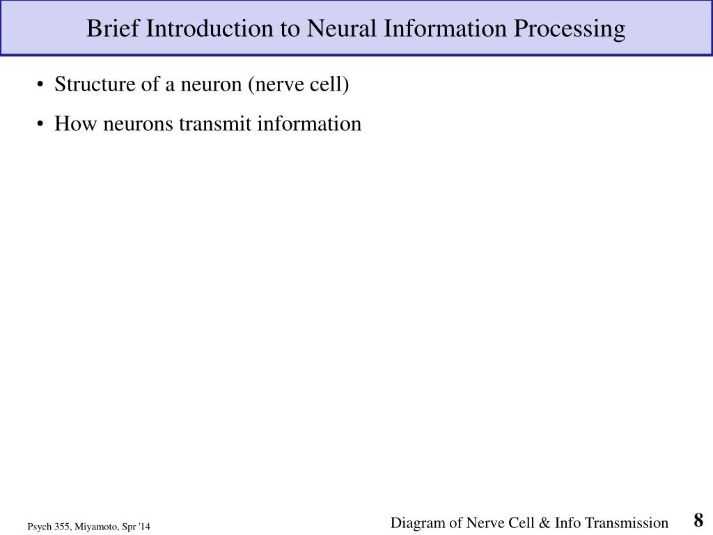 Brief Introduction to Neural Information Processing • Structure of a neuron (nerve cell) • How neurons transmit information Diagram of Nerve Cell & Info Transmission Psych 355, Miyamoto, Spr '14