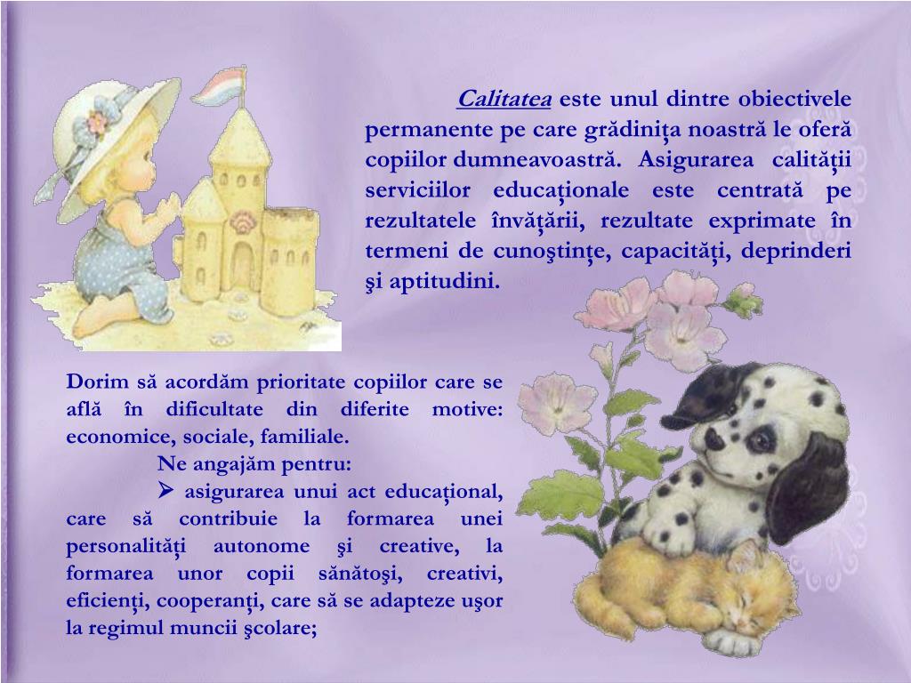 Calitatea este unul dintre obiectivele permanente pe care grădiniţa noastră le oferă copiilor dumneavoastră. Asigurarea calităţii serviciilor educaţionale este centrată pe rezultatele învăţării, rezultate exprimate în termeni de cunoştinţe, capacităţi, deprinderi şi aptitudini. Dorim să acordăm prioritate copiilor care se află în dificultate din diferite motive: economice, sociale, familiale. Ne angajăm pentru: asigurarea unui act educaţional, care să contribuie la formarea unei personalităţi autonome şi creative, la formarea unor copii sănătoşi, creativi, eficienţi, cooperanţi, care să se adapteze uşor la regimul muncii şcolare;