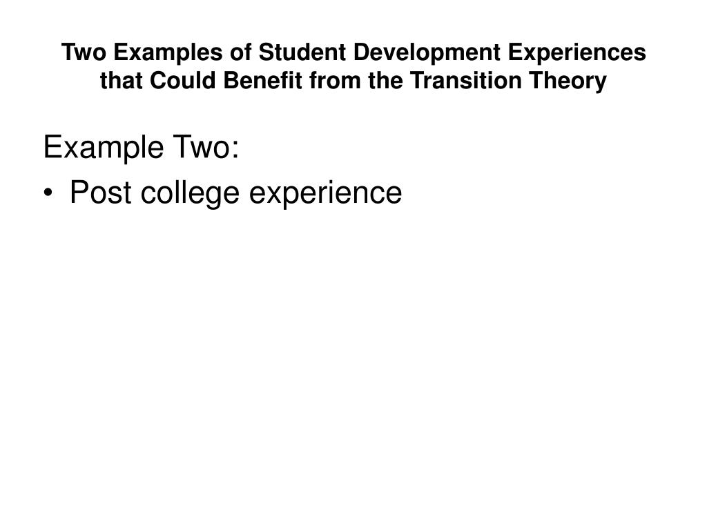 Two Examples of Student Development Experiences that Could Benefit from the Transition Theory Example Two: • Post college experience