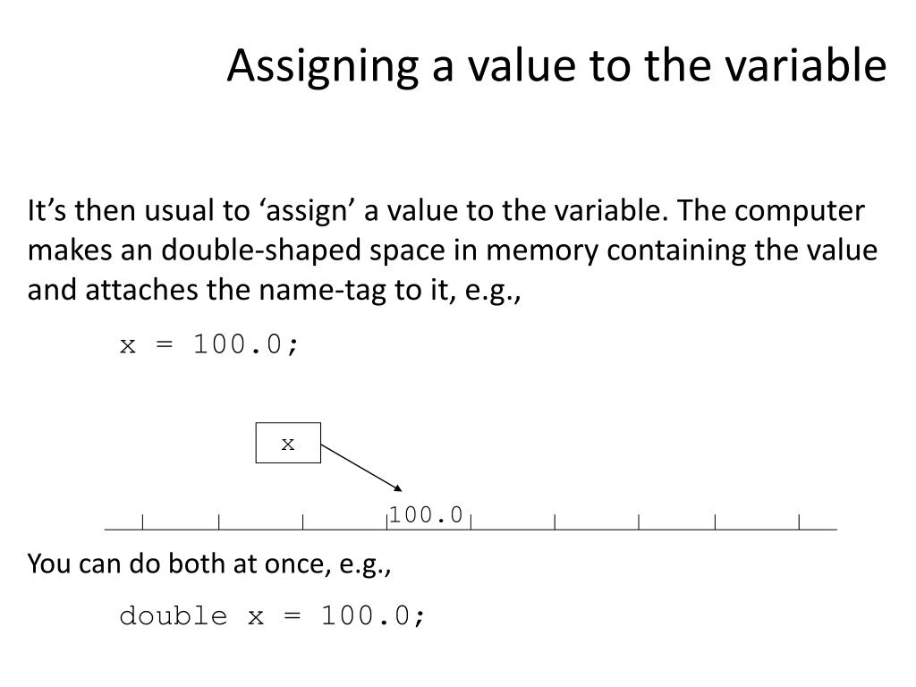 x 100.0 Assigning a value to the variable It’s then usual to ‘assign’ a value to the variable. The computer makes an double-shaped space in memory containing the value and attaches the name-tag to it, e.g., x = 100.0; You can do both at once, e.g., double x = 100.0;