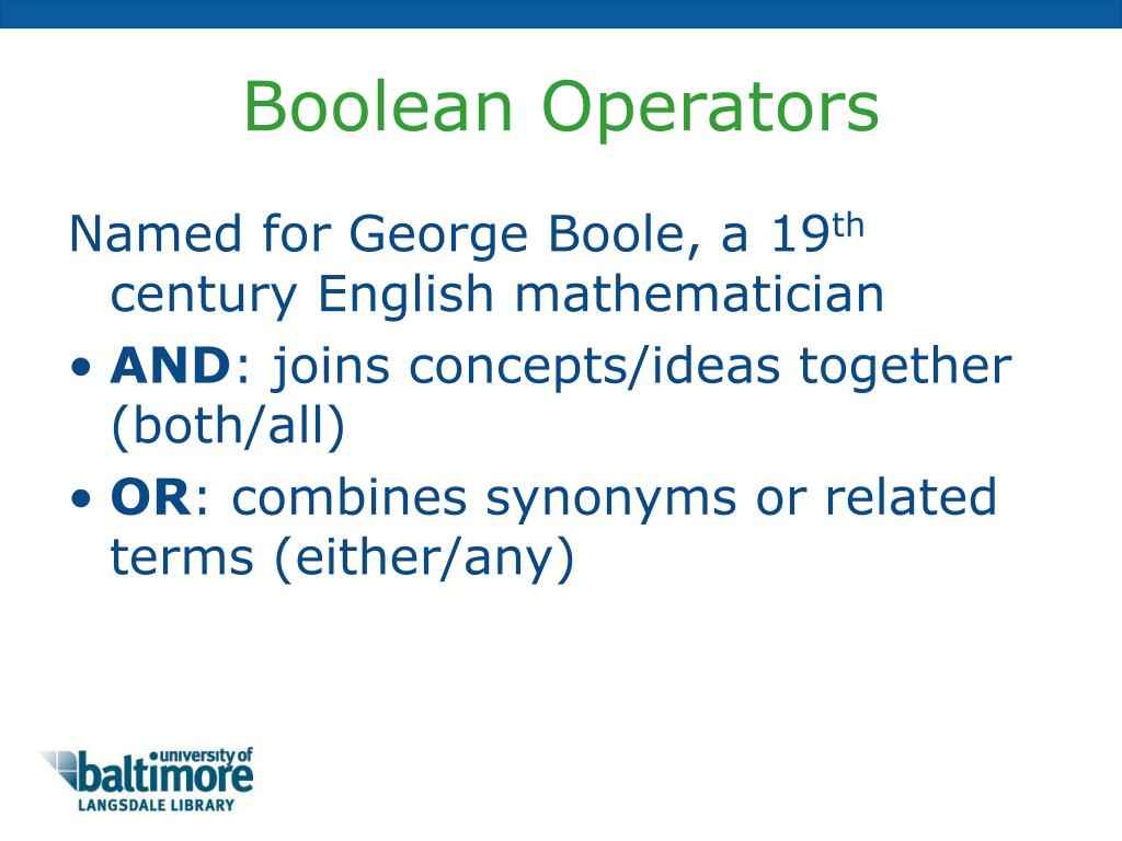 Boolean Operators Named for George Boole, a 19th century English mathematician • AND: joins concepts/ideas together (both/all) • OR: combines synonyms or related terms (either/any)