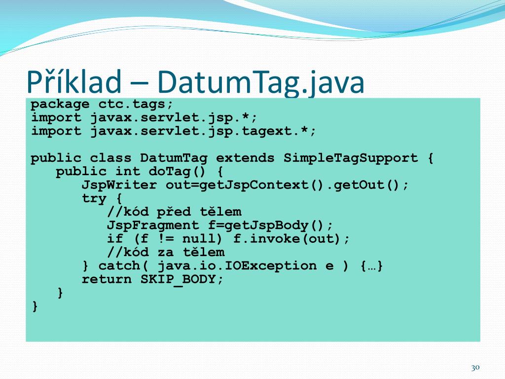 Příklad – DatumTag.java packagectc.tags; import javax.servlet.jsp.*; import javax.servlet.jsp.tagext.*; public class DatumTag extends SimpleTagSupport{ public intdoTag() { JspWriter out=getJspContext().getOut(); try { //kód před tělem JspFragment f=getJspBody(); if (f != null) f.invoke(out); //kód za tělem } catch( java.io.IOException e ) {…} return SKIP_BODY; } }