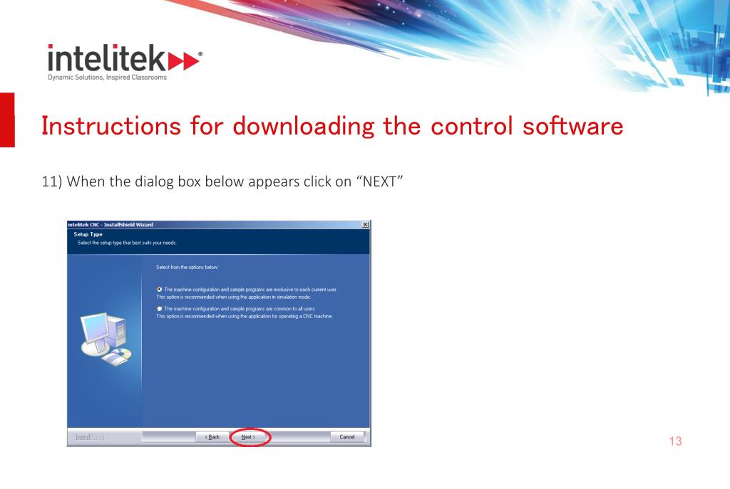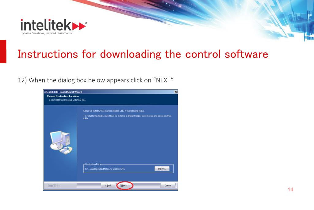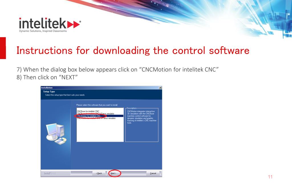 Instructions for downloading the control software 7) When the dialog box below appears click on “CNCMotion for intelitek CNC”8) Then click on “NEXT”