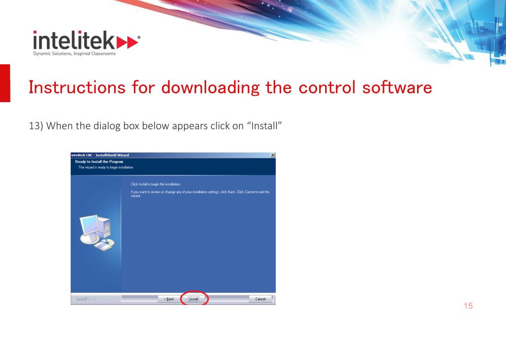 Instructions for downloading the control software 13) When the dialog box below appears click on “Install”