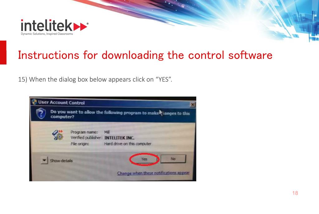 Instructions for downloading the control software 15) When the dialog box below appears click on “YES”.