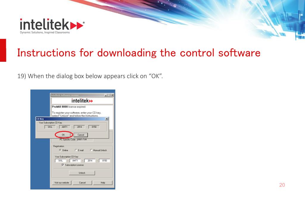 Instructions for downloading the control software 16) In the license dialog box, put a check mark next to “Subscription License”17) Enter the 16 digit CD KEY number “ SKIL-AMT1-2014-015018) Select “UNLOCK”