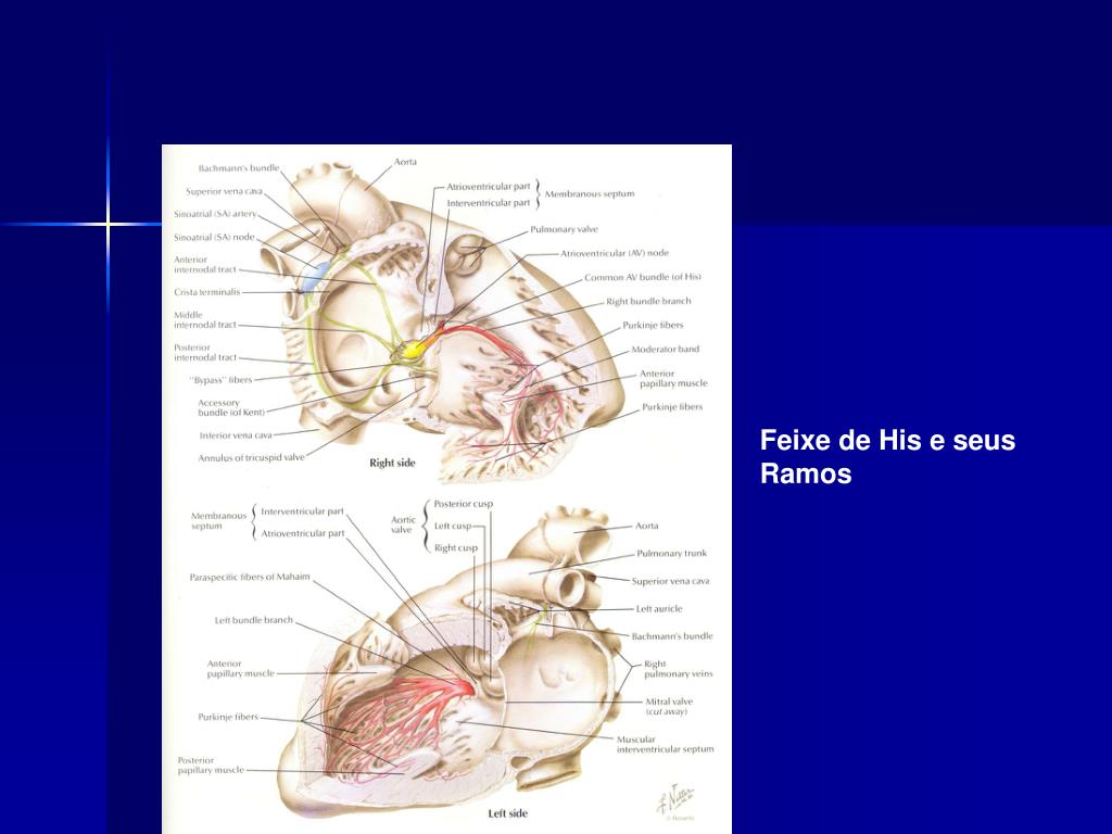 Significado clínico do Bloqueio de Ramo Direito: - Estreita relação com a parte superior do septo ventricular e valvas aórtica e tricúspide. - Surge em lesões Valvares Aórticas e Tricúspides, HAS, Coronariopatias, Miocardiopatias e defeitos do Septo Membranoso. - Surge em defeitos do Septo Atrial ( CIA ) por dilatação do Ventrículo Direito - Embolia Pulmonar. - Miocardiopatia chagásica. - Indivíduos normais.
