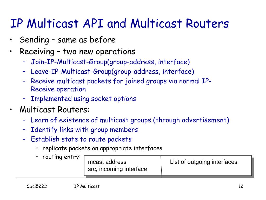 IP Multicast API and Multicast Routers • Sending – same as before • Receiving – two new operations • Join-IP-Multicast-Group(group-address, interface) • Leave-IP-Multicast-Group(group-address, interface) • Receive multicast packets for joined groups via normal IP-Receive operation • Implemented using socket options • Multicast Routers: • Learn of existence of multicast groups (through advertisement) • Identify links with group members • Establish state to route packets • replicate packets on appropriate interfaces • routing entry: mcast address src, incoming interface List of outgoing interfaces CSci5221: IP Multicast
