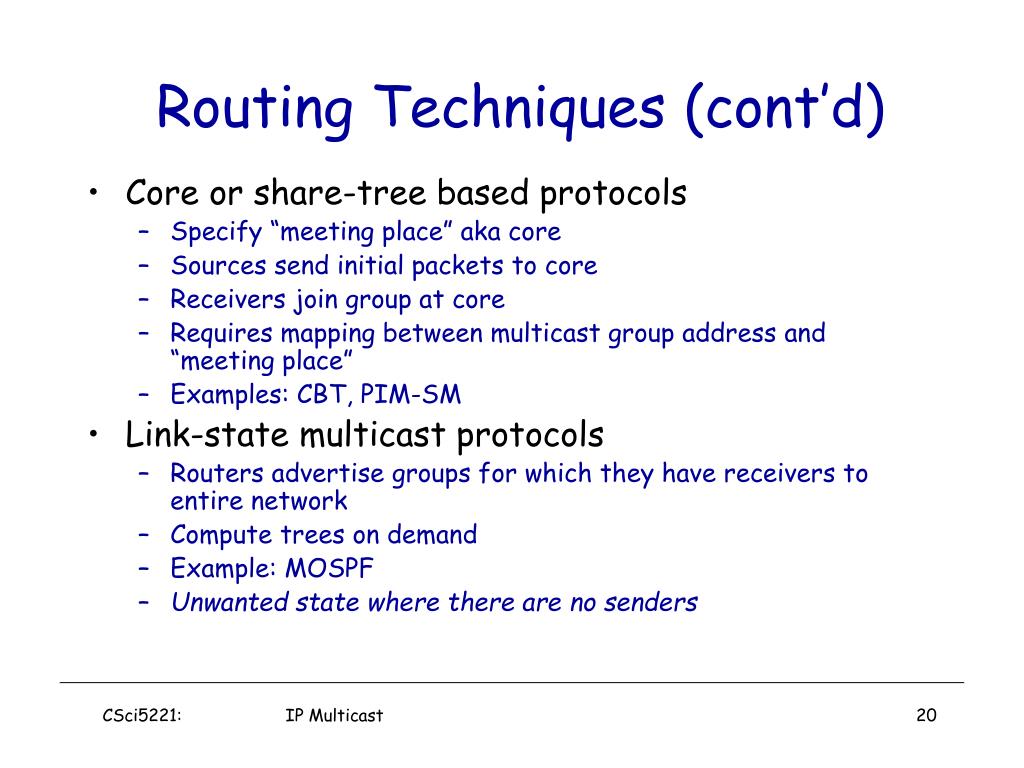 Routing Techniques (cont’d) • Core or share-tree based protocols • Specify “meeting place” aka core • Sources send initial packets to core • Receivers join group at core • Requires mapping between multicast group address and “meeting place” • Examples: CBT, PIM-SM • Link-state multicast protocols • Routers advertise groups for which they have receivers to entire network • Compute trees on demand • Example: MOSPF • Unwanted state where there are no senders CSci5221: IP Multicast