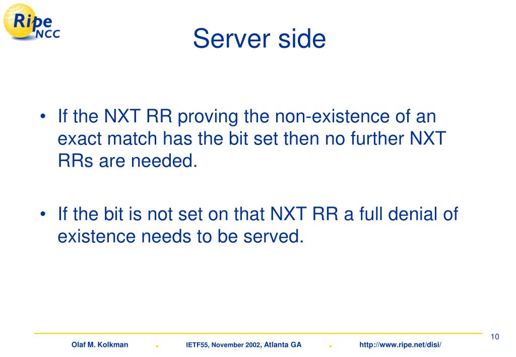 Server side • If the NXT RR proving the non-existence of an exact match has the bit set then no further NXT RRs are needed. • If the bit is not set on that NXT RR a full denial of existence needs to be served.