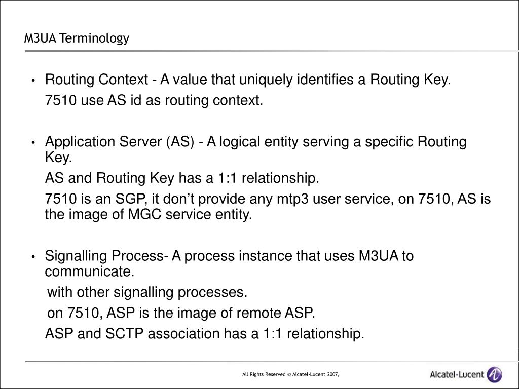 M3UA Terminology • Routing Context - A value that uniquely identifies a Routing Key. 7510 use AS id as routing context. • Application Server (AS) - A logical entity serving a specific Routing Key. AS and Routing Key has a 1:1 relationship. 7510 is an SGP, it don’t provide any mtp3 user service, on 7510, AS is the image of MGC service entity. • Signalling Process- A process instance that uses M3UA to communicate. with other signalling processes. on 7510, ASP is the image of remote ASP. ASP and SCTP association has a 1:1 relationship.