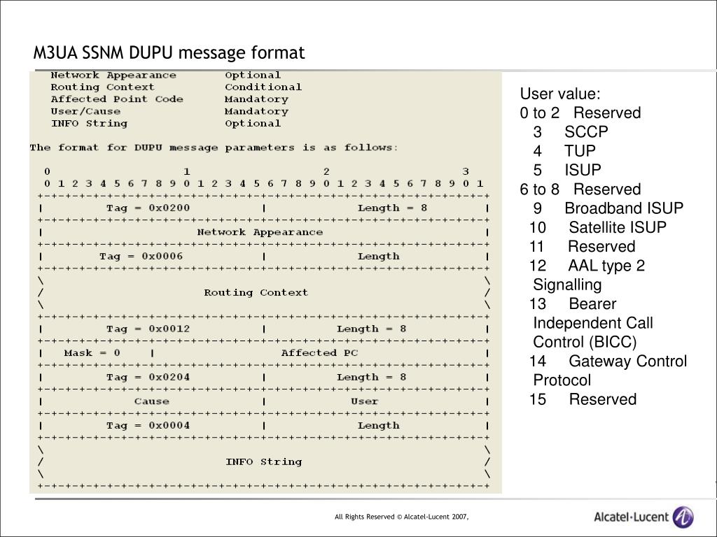 M3UA SSNM DUPU message format User value: 0 to 2 Reserved 3 SCCP 4 TUP 5 ISUP 6 to 8 Reserved 9 Broadband ISUP 10 Satellite ISUP 11 Reserved 12 AAL type 2 Signalling 13 Bearer Independent Call Control (BICC) 14 Gateway Control Protocol 15 Reserved
