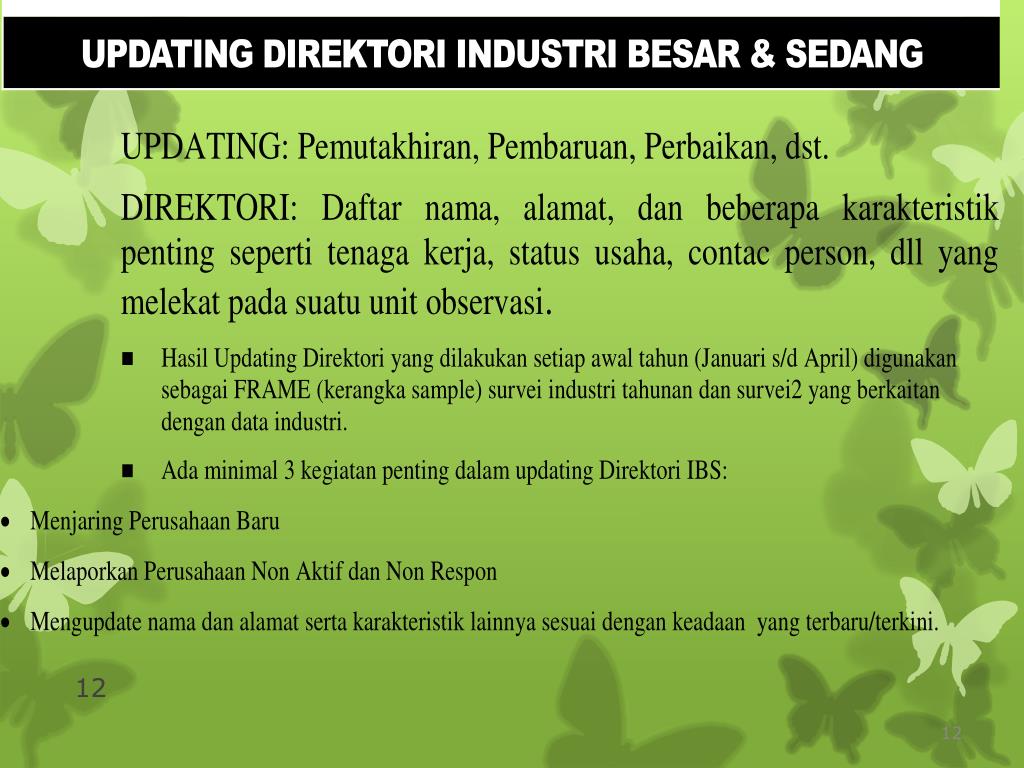 Kegiatan penting dalam Updating Direktori 1. Menjaring perusahaan baru (dilakukan di BPS Prov dan BPS KabKot) melakukan matching antara direktori yg di miliki BPS dengan direktori dari instansi lain (Depprin, BKPM/BKPMD, Depkes, Dinas terkait, dll), dan temuan KSK/Staf di lapangan 2. Memutakhirkan direktori (dilakukan di BPS Pusat dan Daerah) yaitu melaporkan perusahaan tutup, pindah, berubah nama, badan hukum/usaha, alamat, TK, contac person, dll 3. Sebagai salah satu sarana dalam manajemen survei contoh 1. dalam hal penerimaan / pengiriman dokumen 2. monitoring pemasukan dokumen survei Catatan: Matching yaitu membandingkan daftar perusahaan yang berasal dari instansi lain dengan direktori BPS yg disusun menurut abjad, untuk mencari nama perusahaan yg belum tercantum di direktori BPS 2.Direktori selalu diupdate dengan memperbaiki nama, alamat, no telp, contac person, dll sesuai dengan keadaan yg terbaru dan melaporkan perusahaan yang tutup, berubah kegiatan atau berubah skala tenaga kerja dengan daftar II-B