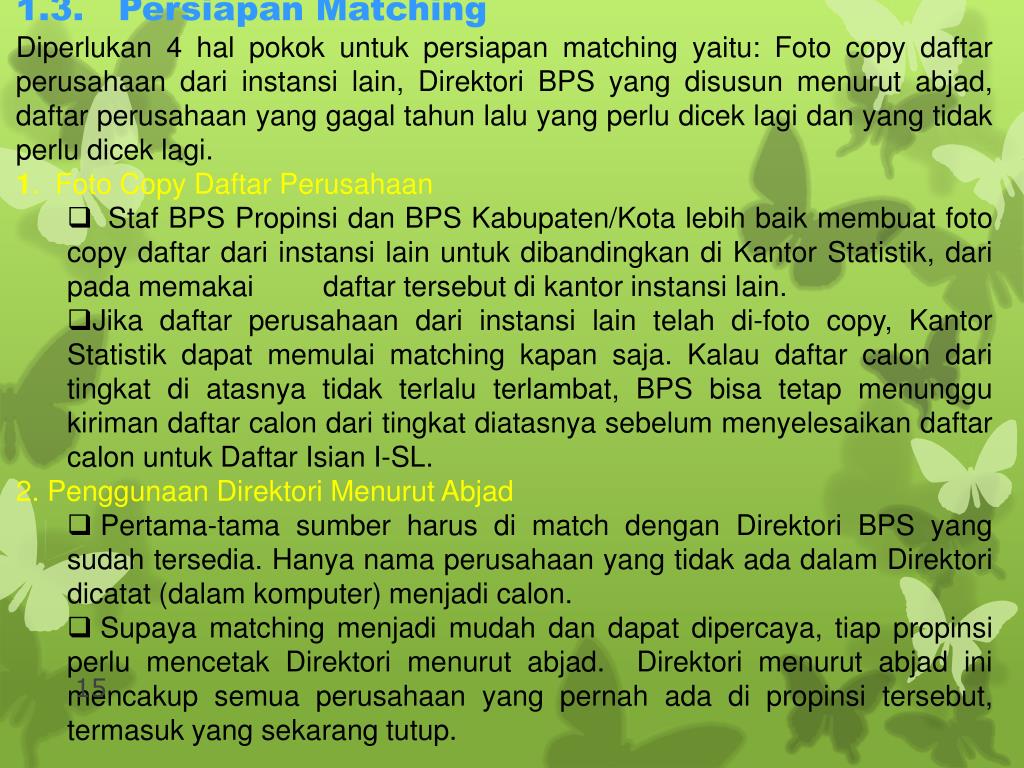 1.3. Persiapan Matching • Diperlukan 4 halpokokuntukpersiapan matching yaitu: Foto copy daftarperusahaandariinstansi lain, Direktori BPS yang disusunmenurutabjad, daftarperusahaan yang gagaltahunlalu yang perludiceklagidan yang tidakperludiceklagi. • 1. Foto Copy Daftar Perusahaan • Staf BPS Propinsidan BPS Kabupaten/Kota lebihbaikmembuatfoto copy daftardariinstansi lain untukdibandingkandi Kantor Statistik, daripadamemakaidaftartersebutdikantorinstansi lain. • Jikadaftarperusahaandariinstansi lain telahdi-foto copy, Kantor Statistikdapatmemulai matching kapansaja. Kalaudaftarcalondaritingkatdiatasnyatidakterlaluterlambat, BPS bisatetapmenunggukirimandaftarcalondaritingkatdiatasnyasebelummenyelesaikandaftarcalonuntukDaftarIsian I-SL. • 2. PenggunaanDirektoriMenurutAbjad • Pertama-tama sumberharusdi match denganDirektori BPS yang sudahtersedia. Hanyanamaperusahaan yang tidakadadalamDirektoridicatat (dalamkomputer) menjadicalon. • Supaya matching menjadimudahdandapatdipercaya, tiappropinsiperlumencetakDirektorimenurutabjad. Direktorimenurutabjadinimencakupsemuaperusahaan yang pernahadadipropinsitersebut, termasuk yang sekarangtutup.