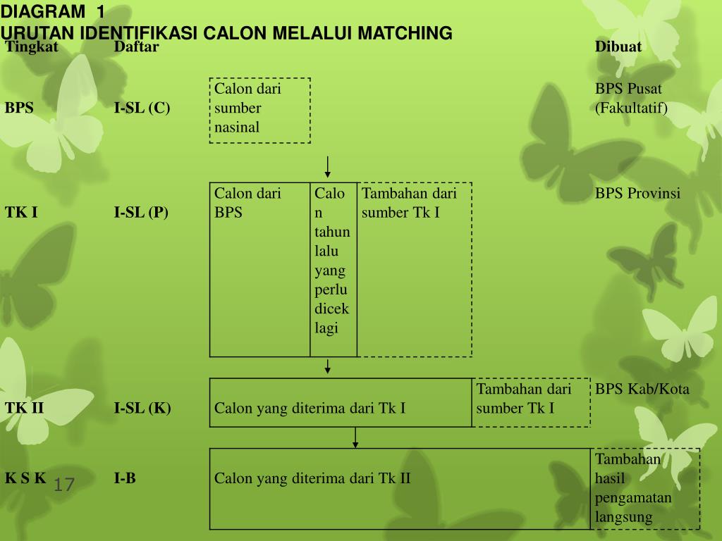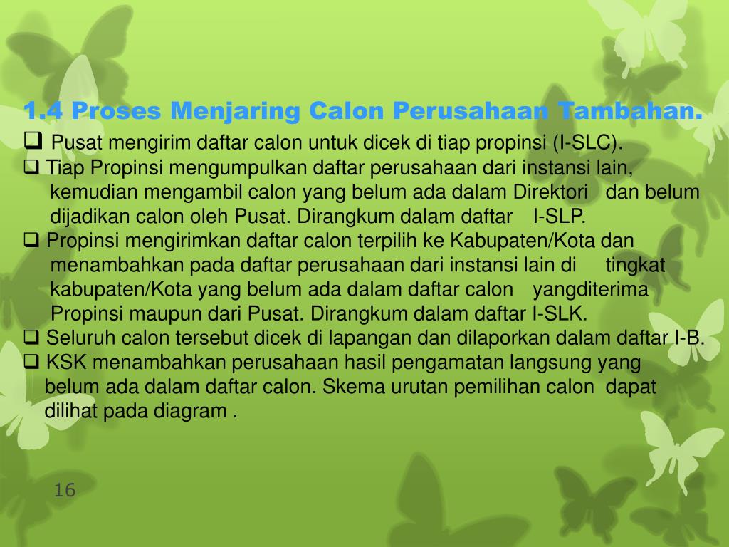 1.4 ProsesMenjaringCalon Perusahaan Tambahan. • Pusatmengirimdaftarcalonuntukdicekditiappropinsi (I-SLC). • TiapPropinsimengumpulkandaftarperusahaandariinstansi lain, • kemudianmengambilcalon yang belumadadalamDirektoridanbelum • dijadikancalonolehPusat. Dirangkumdalamdaftar I-SLP. • PropinsimengirimkandaftarcalonterpilihkeKabupaten/Kota dan • menambahkanpadadaftarperusahaandariinstansi lain di tingkat • kabupaten/Kota yang belumadadalamdaftarcalonyangditerima • PropinsimaupundariPusat. DirangkumdalamdaftarI-SLK. • Seluruhcalontersebutdicek di lapangandandilaporkandalamdaftarI-B. • KSK menambahkanperusahaanhasilpengamatanlangsungyang • belumadadalamdaftarcalon. Skemaurutanpemilihancalondapat • dilihatpada diagram .