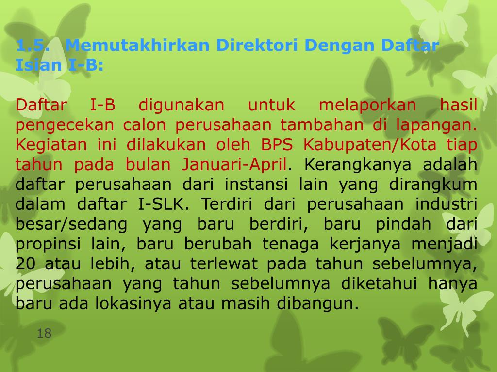 1.5. Memutakhirkan Direktori Dengan Daftar Isian I-B: Daftar I-B digunakan untuk melaporkan hasil pengecekan calon perusahaan tambahan di lapangan. Kegiatan ini dilakukan oleh BPS Kabupaten/Kota tiap tahun pada bulan Januari-April. Kerangkanya adalah daftar perusahaan dari instansi lain yang dirangkum dalam daftar I-SLK. Terdiri dari perusahaan industri besar/sedang yang baru berdiri, baru pindah dari propinsi lain, baru berubah tenaga kerjanya menjadi 20 atau lebih, atau terlewat pada tahun sebelumnya, perusahaan yang tahun sebelumnya diketahui hanya baru ada lokasinya atau masih dibangun.
