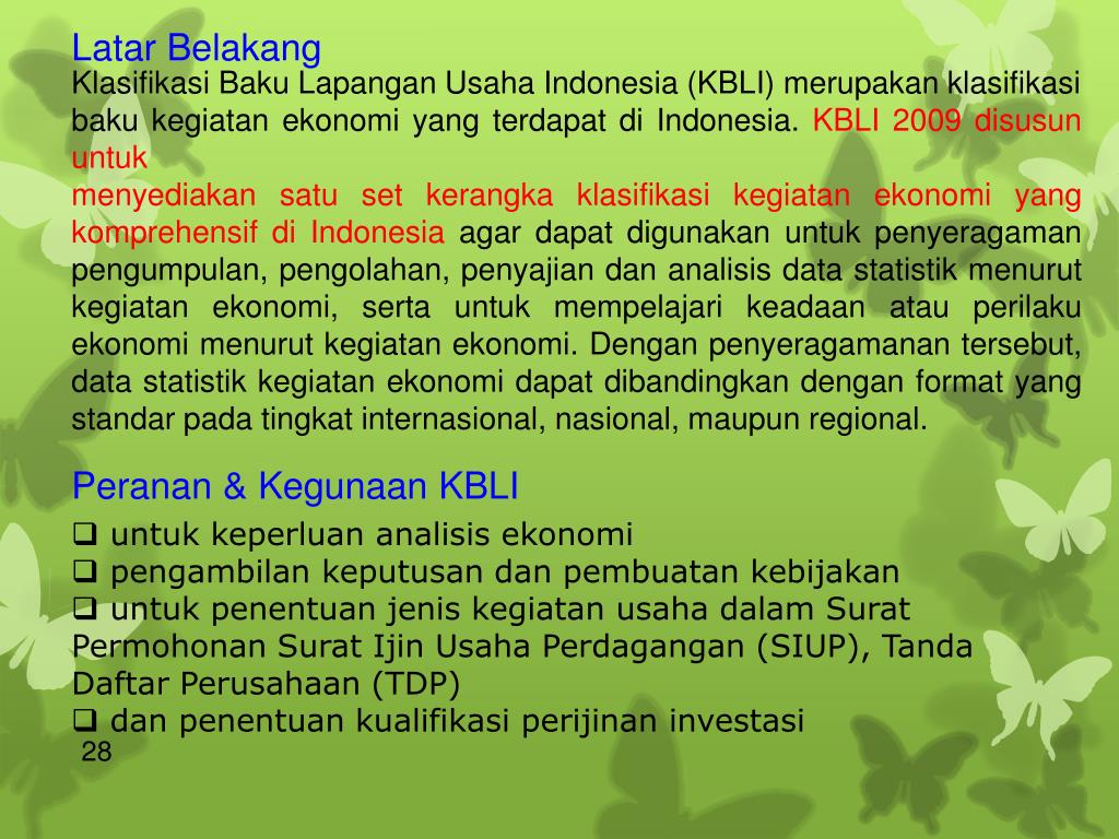 Latar Belakang Klasifikasi Baku Lapangan Usaha Indonesia (KBLI) merupakan klasifikasi baku kegiatan ekonomi yang terdapat di Indonesia. KBLI 2009 disusun untuk menyediakan satu set kerangka klasifikasi kegiatan ekonomi yang komprehensif di Indonesia agar dapat digunakan untuk penyeragaman pengumpulan, pengolahan, penyajian dan analisis data statistik menurut kegiatan ekonomi, serta untuk mempelajari keadaan atau perilaku ekonomi menurut kegiatan ekonomi. Dengan penyeragamanan tersebut, data statistik kegiatan ekonomi dapat dibandingkan dengan format yang standar pada tingkat internasional, nasional, maupun regional. Peranan & Kegunaan KBLI • untuk keperluan analisis ekonomi • pengambilan keputusan dan pembuatan kebijakan • untuk penentuan jenis kegiatan usaha dalam Surat Permohonan Surat Ijin Usaha Perdagangan (SIUP), Tanda Daftar Perusahaan (TDP) • dan penentuan kualifikasi perijinan investasi