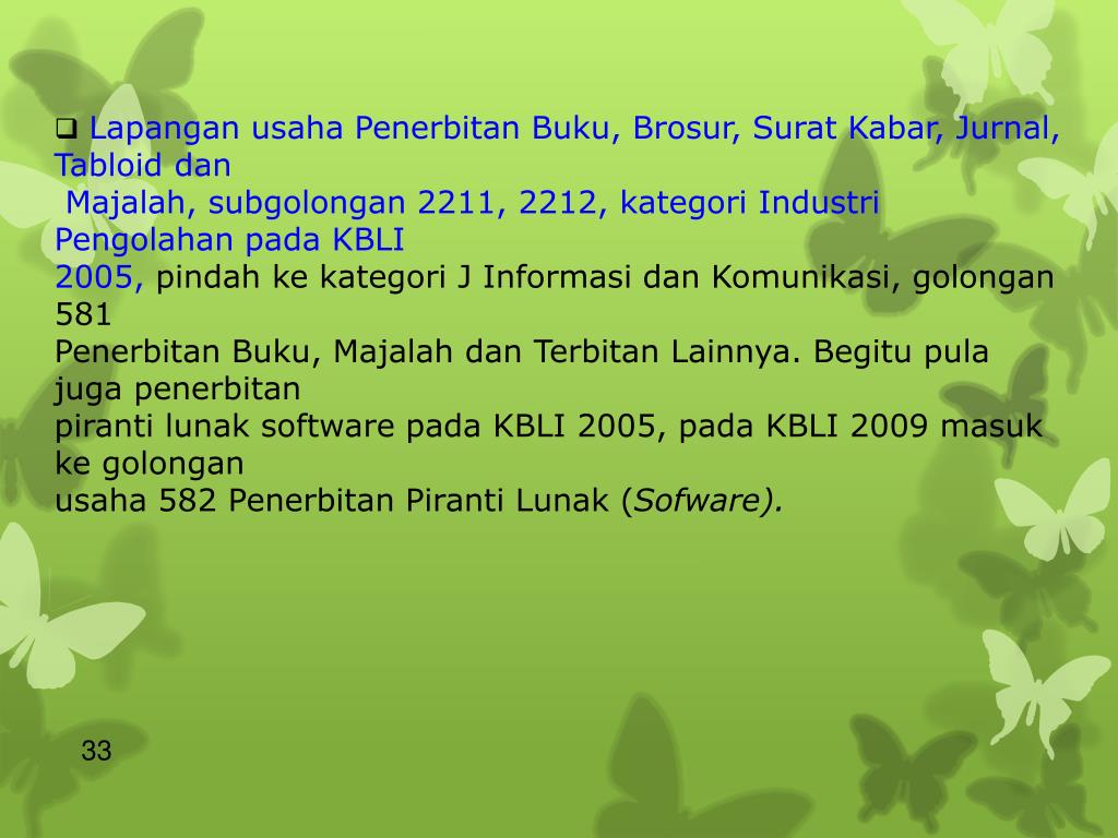 Lapangan usaha Penerbitan Buku, Brosur, Surat Kabar, Jurnal, Tabloid dan • Majalah, subgolongan 2211, 2212, kategori Industri Pengolahan pada KBLI • 2005, pindah ke kategori J Informasi dan Komunikasi, golongan 581 • Penerbitan Buku, Majalah dan Terbitan Lainnya. Begitu pula juga penerbitan • piranti lunak software pada KBLI 2005, pada KBLI 2009 masuk ke golongan • usaha 582 Penerbitan Piranti Lunak (Sofware).