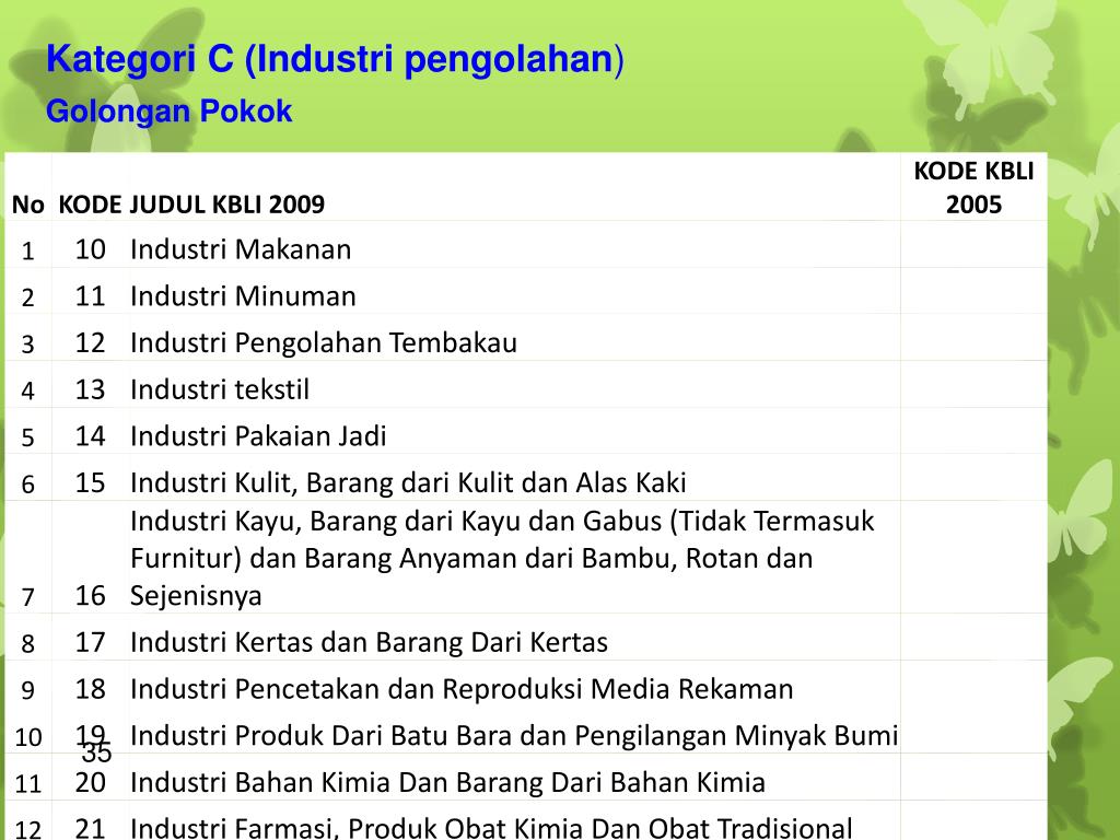 BeberapaKode KBLI 2005 yang bukanKategoriIndustriPengolahanlagi di KBLI 2009 KBLI 22 (industripenerbitan, percetakandanreproduksi media rekaman) masukkeKategori J di KBLI 2009 (InformasidanKomunikasi) Produksikomposdansampahorganik, kelompok 24121 IndustriPupukAlam/Non Sintesis Hara Makro Primer pada KBLI 2005, darikategori D IndustriPengolahan, pindahkekategori E Pengadaan Air, Pengelolaan,Pembuangan, danPembersihanLimbahdanSampah, kelompokusaha 38212 ProduksiKomposSampahOrganik PengolahanDaurUlangBarang-barangLogam, kelompok 37100, Daur UlangBarang-barangBukanLogam, kelompok 37200, kategori C Industri Pengolahanpada KBLI 2005, pindahkekategori E Pengadaan Air, PengelolaanSampahdanDaurUlang, Pembuangan Dan Pembersihan Limbah Dan Sampah, kelompok 38301 DaurUlangBarangLogam, dan kelompok 38302 DaurUlangBarangBukanLogampada KBLI 2009. Begitu pula kelompok 35114 pemotongankapal, pindahkekelompok 38303 PemotonganKapal (Ship Breaking).