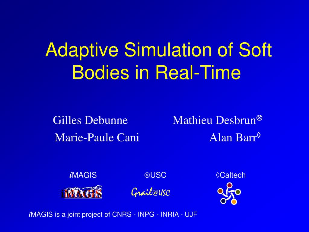 Adaptive Simulation of Soft Bodies in Real-Time Gilles Debunne Mathieu Desbrun Marie-Paule Cani Alan Barr iMAGIS USC Caltech iMAGIS is a joint project of CNRS - INPG - INRIA - UJF Grail@USC