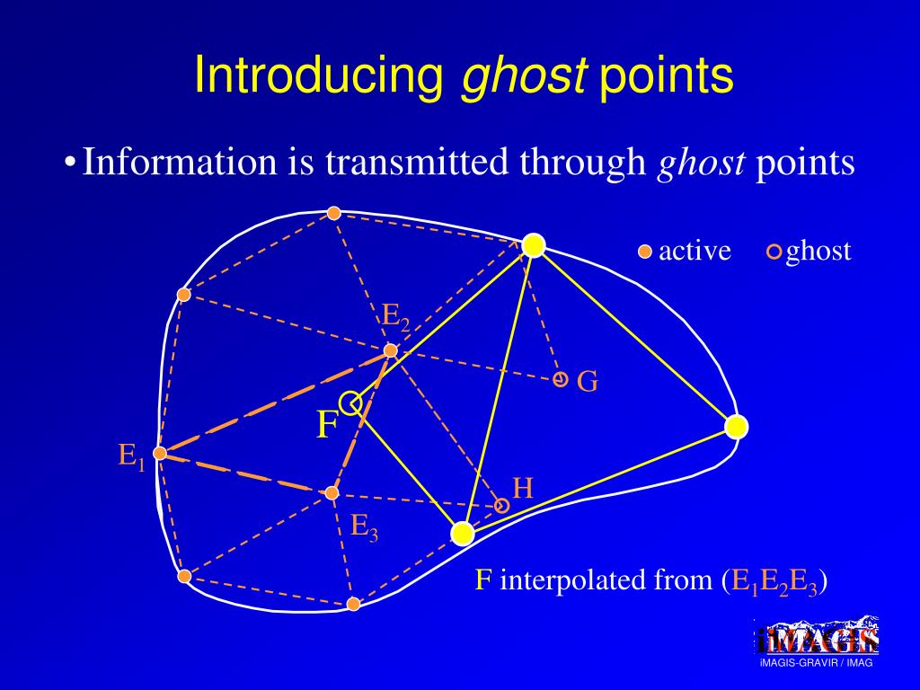 Introducing ghost points • Information is transmitted through ghost points active ghost E2 G F E1 H E3 F interpolated from (E1E2E3)