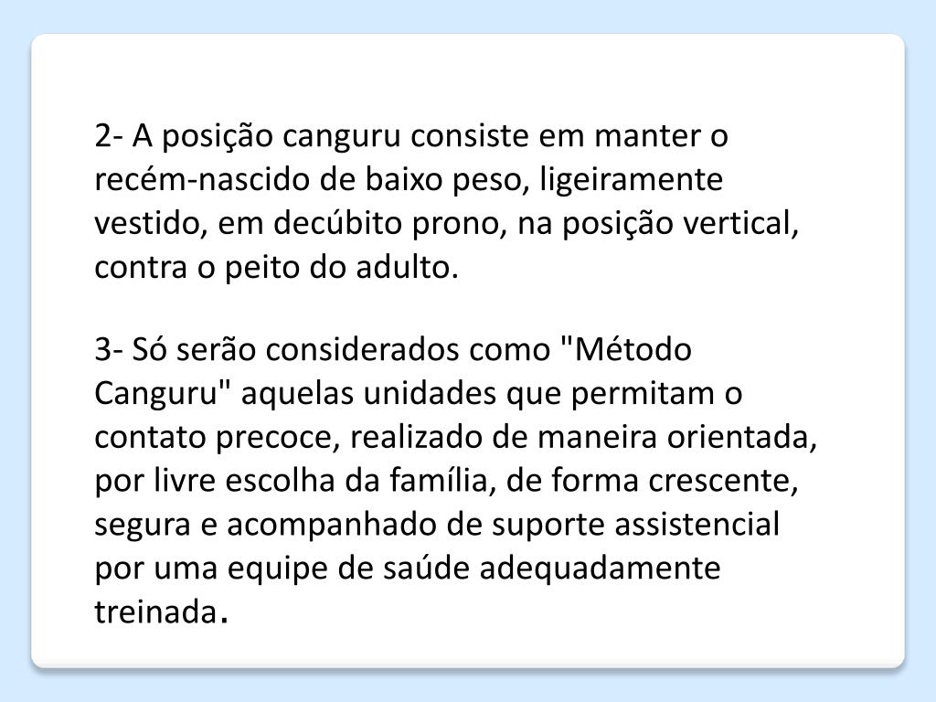 2- A posição canguru consiste em manter o recém-nascido de baixo peso, ligeiramente vestido, em decúbito prono, na posição vertical, contra o peito do adulto. 3- Só serão considerados como "Método Canguru" aquelas unidades que permitam o contato precoce, realizado de maneira orientada, por livre escolha da família, de forma crescente, segura e acompanhado de suporte assistencial por uma equipe de saúde adequadamente treinada.