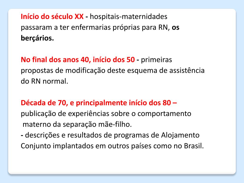 Início do século XX - hospitais-maternidades passaram a ter enfermarias próprias para RN, os berçários. No final dos anos 40, início dos 50 - primeiras propostas de modificação deste esquema de assistência do RN normal. Década de 70, e principalmente início dos 80 – publicação de experiências sobre o comportamento materno da separação mãe-filho. - descrições e resultados de programas de Alojamento Conjunto implantados em outros países como no Brasil.