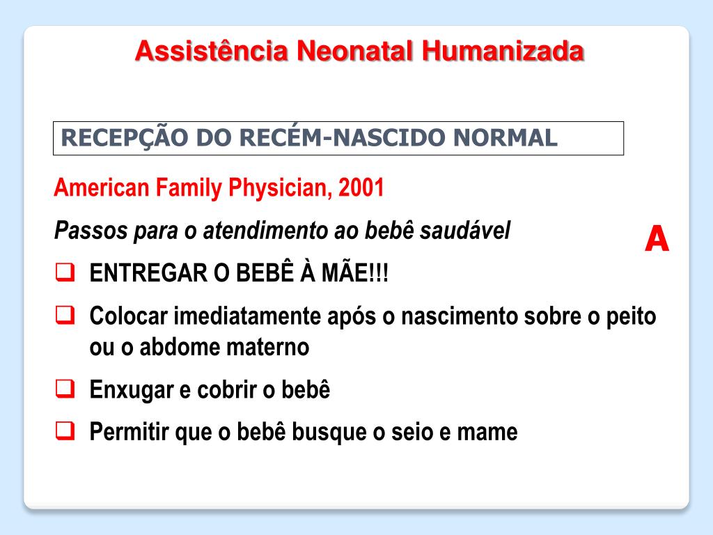 Assistência Neonatal Humanizada RECEPÇÃO DO RECÉM-NASCIDO NORMAL • American Family Physician, 2001 • Passos para o atendimento ao bebê saudável • ENTREGAR O BEBÊ À MÃE!!! • Colocar imediatamente após o nascimento sobre o peito ou o abdome materno • Enxugar e cobrir o bebê • Permitir que o bebê busque o seio e mame A