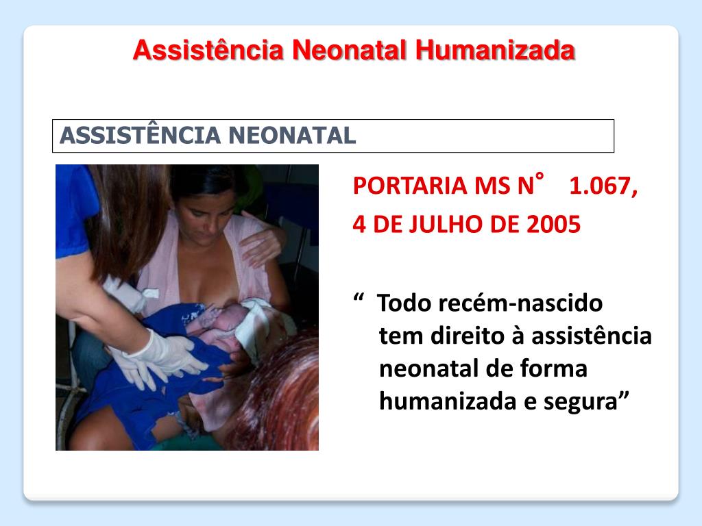 Assistência Neonatal Humanizada ASSISTÊNCIA NEONATAL PORTARIA MS N° 1.067, 4 DE JULHO DE 2005 “ Todo recém-nascido tem direito à assistência neonatal de forma humanizada e segura”