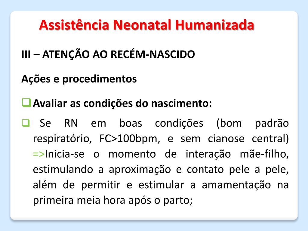 Assistência Neonatal Humanizada • III – ATENÇÃO AO RECÉM-NASCIDO • Ações e procedimentos • Avaliar as condições do nascimento: • Se RN em boas condições (bom padrão respiratório, FC>100bpm, e sem cianose central) =>Inicia-se o momento de interação mãe-filho, estimulando a aproximação e contato pele a pele, além de permitir e estimular a amamentação na primeira meia hora após o parto;