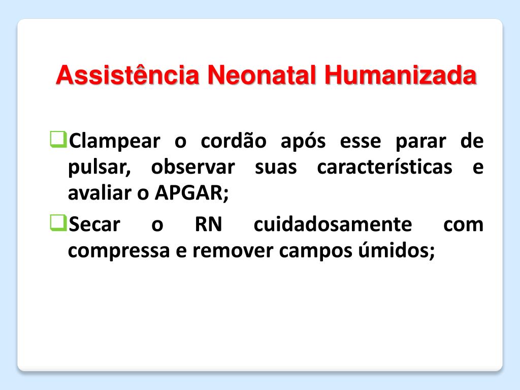 Assistência Neonatal Humanizada • Clampear o cordão após esse parar de pulsar, observar suas características e avaliar o APGAR; • Secar o RN cuidadosamente com compressa e remover campos úmidos;