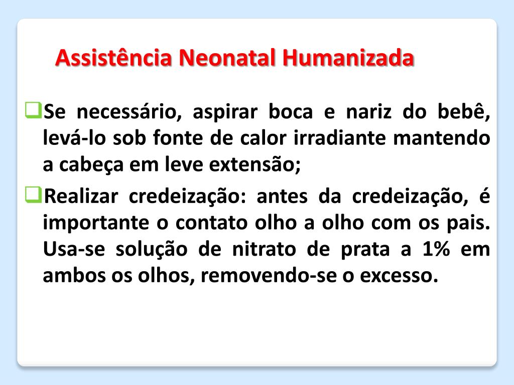 Assistência Neonatal Humanizada • Se necessário, aspirar boca e nariz do bebê, levá-lo sob fonte de calor irradiante mantendo a cabeça em leve extensão; • Realizar credeização: antes da credeização, é importante o contato olho a olho com os pais. Usa-se solução de nitrato de prata a 1% em ambos os olhos, removendo-se o excesso.
