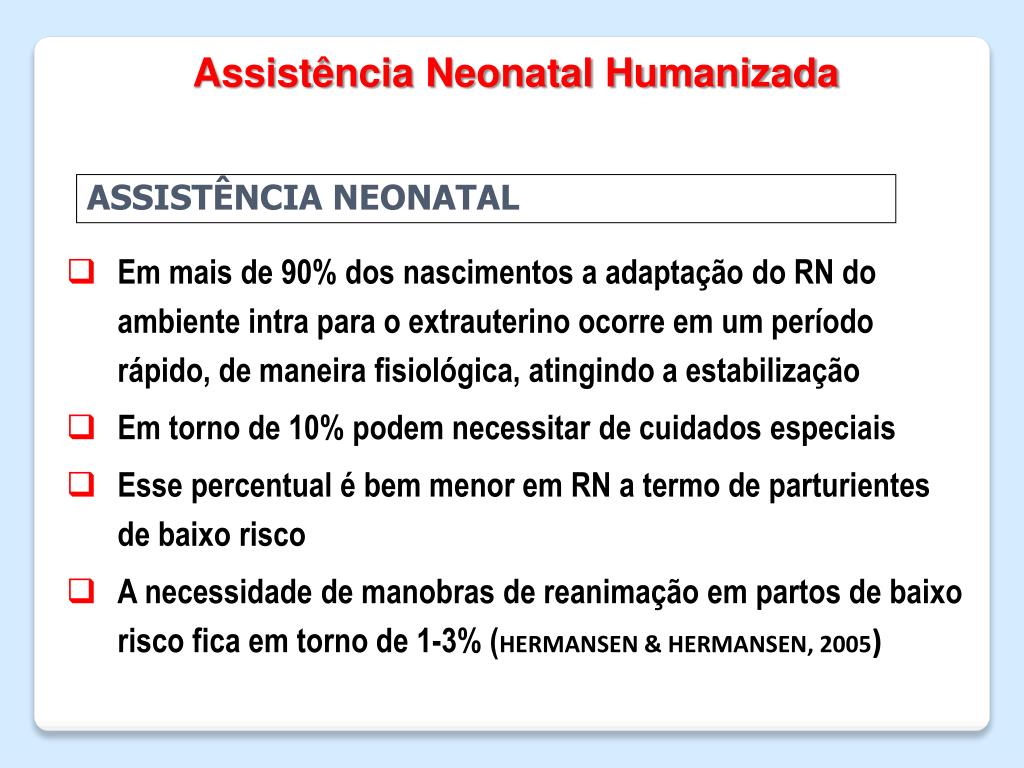 Assistência Neonatal Humanizada ASSISTÊNCIA NEONATAL • Em mais de 90% dos nascimentos a adaptação do RN do ambiente intra para o extrauterino ocorre em um período rápido, de maneira fisiológica, atingindo a estabilização • Em torno de 10% podem necessitar de cuidados especiais • Esse percentual é bem menor em RN a termo de parturientes de baixo risco • A necessidade de manobras de reanimação em partos de baixo risco fica em torno de 1-3% (HERMANSEN & HERMANSEN, 2005)