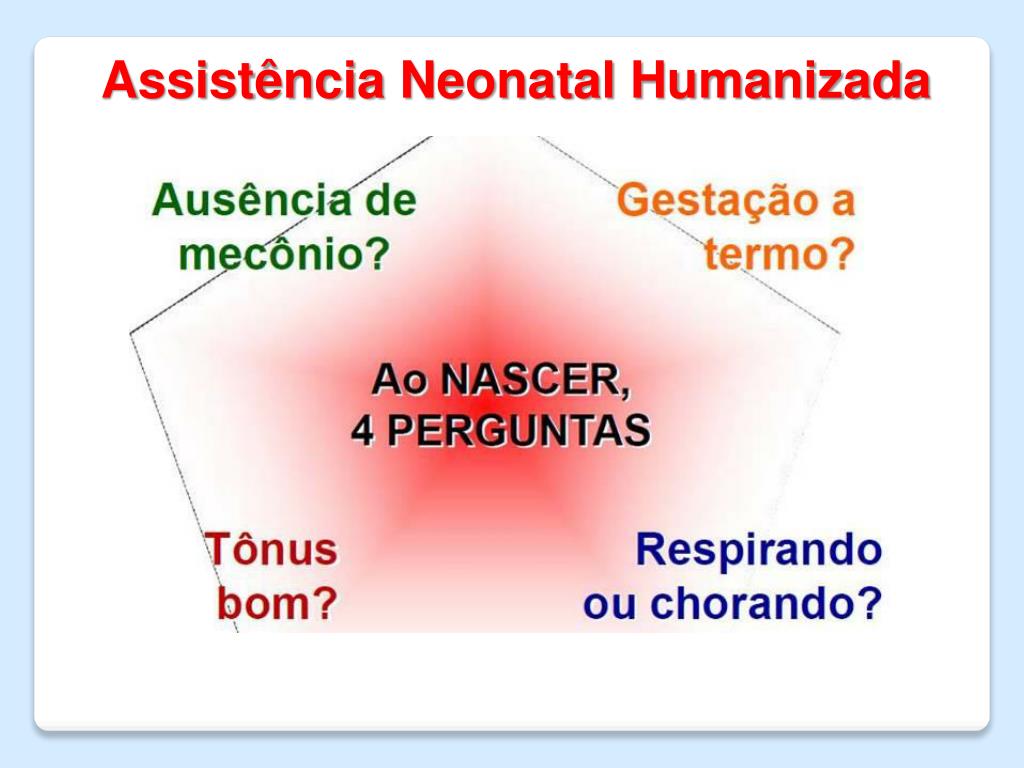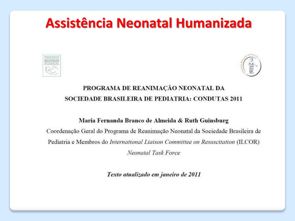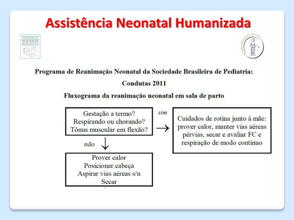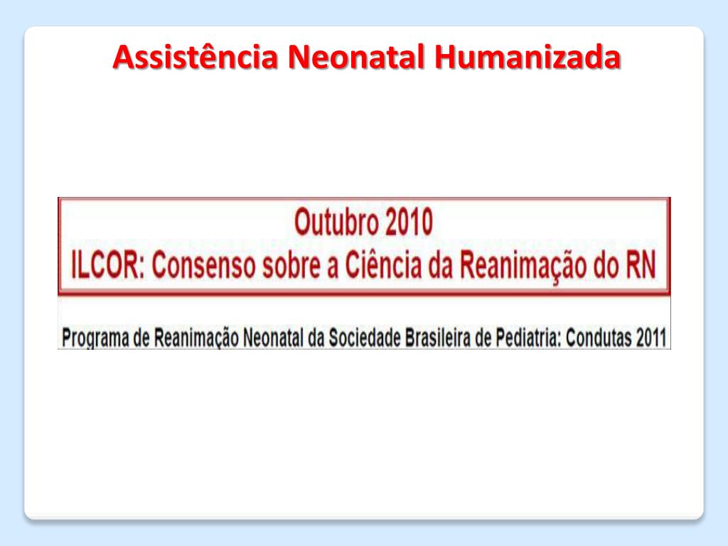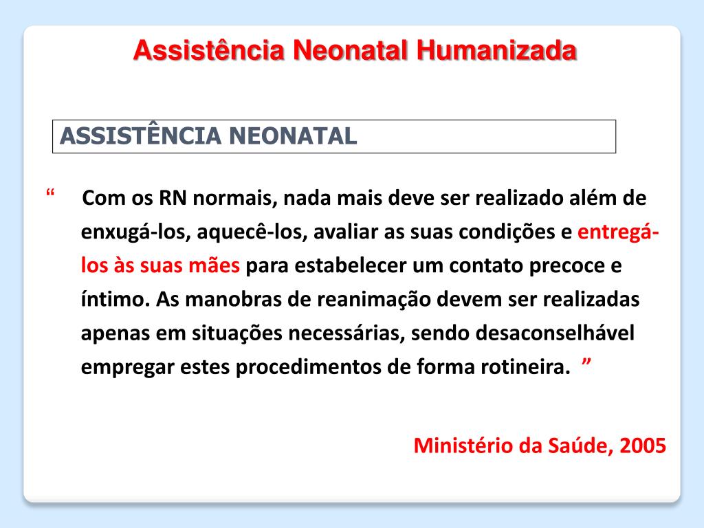 Assistência Neonatal Humanizada ASSISTÊNCIA NEONATAL • “Com os RN normais, nada mais deve ser realizado além de enxugá-los, aquecê-los, avaliar as suas condições e entregá-los às suas mães para estabelecer um contato precoce e íntimo. As manobras de reanimação devem ser realizadas apenas em situações necessárias, sendo desaconselhável empregar estes procedimentos de forma rotineira. ” • Ministério da Saúde, 2005