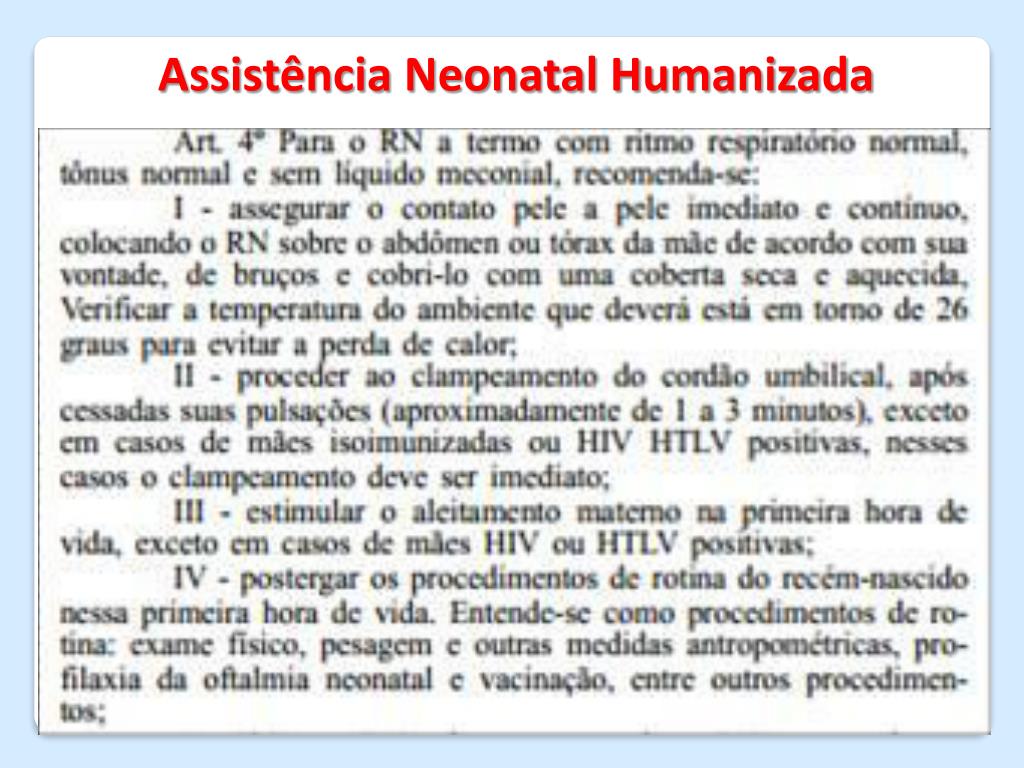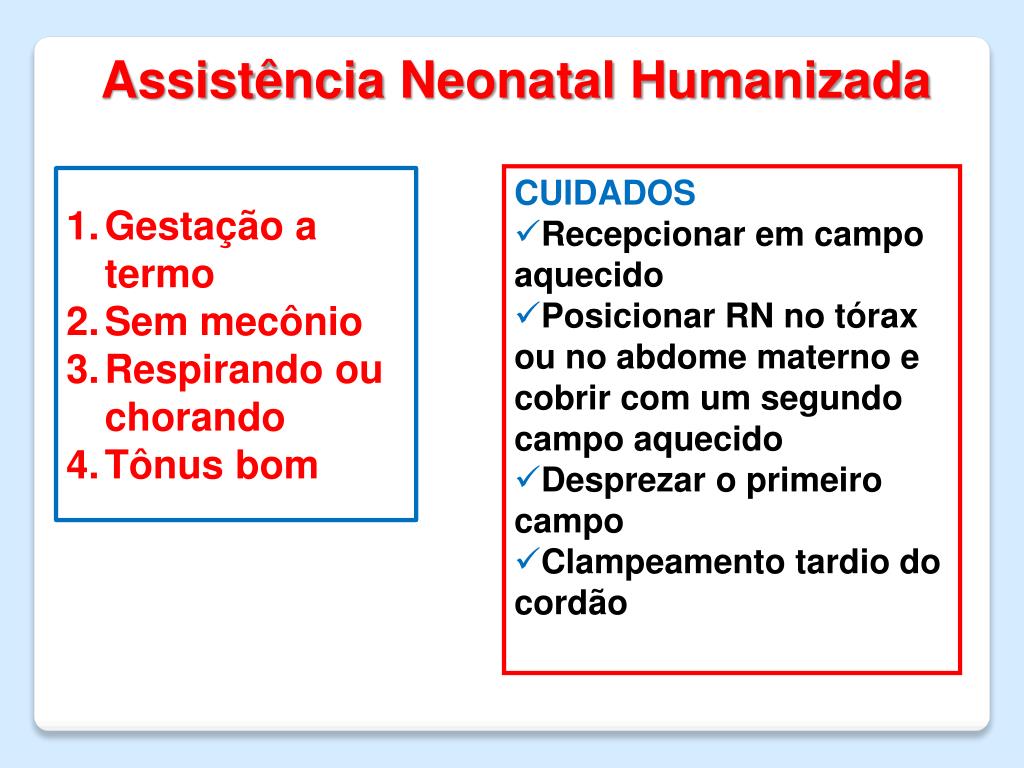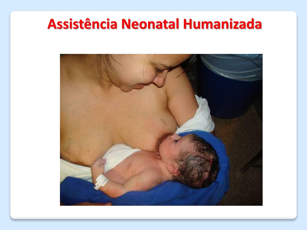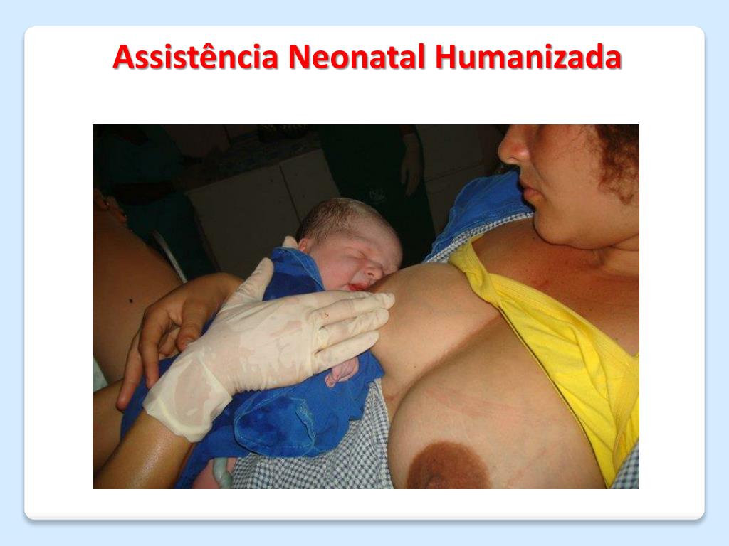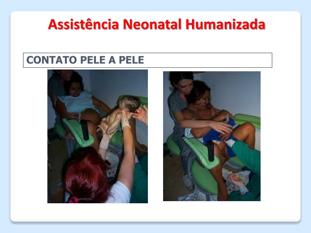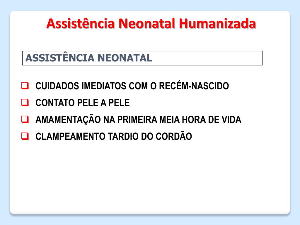 Assistência Neonatal Humanizada ASSISTÊNCIA NEONATAL • CUIDADOS IMEDIATOS COM O RECÉM-NASCIDO • CONTATO PELE A PELE • AMAMENTAÇÃO NA PRIMEIRA MEIA HORA DE VIDA • CLAMPEAMENTO TARDIO DO CORDÃO