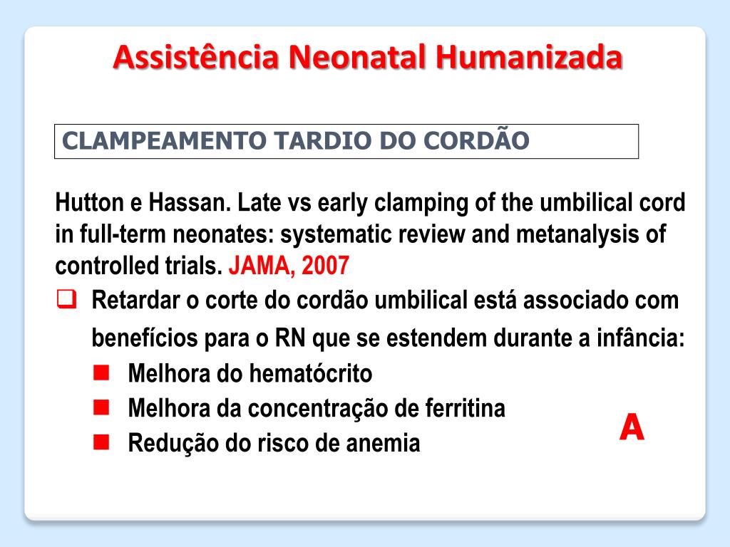 Assistência Neonatal Humanizada CLAMPEAMENTO TARDIO DO CORDÃO • Hutton e Hassan. Late vs early clamping of the umbilical cord • in full-term neonates: systematic review and metanalysis of • controlled trials. JAMA, 2007 • Retardar o corte do cordão umbilical está associado com benefícios para o RN que se estendem durante a infância: • Melhora do hematócrito • Melhora da concentração de ferritina • Redução do risco de anemia A