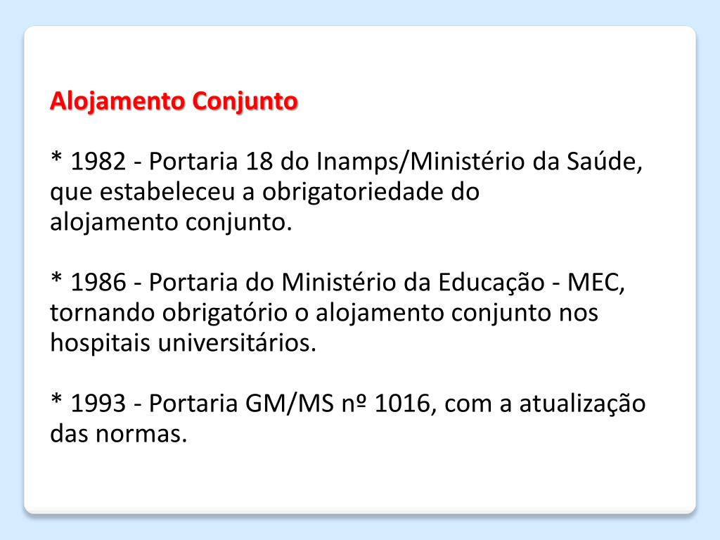 Alojamento Conjunto * 1982 - Portaria 18 do Inamps/Ministério da Saúde, que estabeleceu a obrigatoriedade do alojamento conjunto. * 1986 - Portaria do Ministério da Educação - MEC, tornando obrigatório o alojamento conjunto nos hospitais universitários. * 1993 - Portaria GM/MS nº 1016, com a atualização das normas.