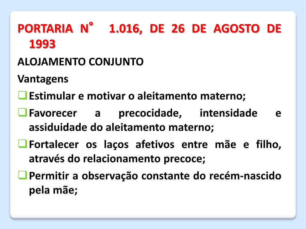PORTARIA N° 1.016, DE 26 DE AGOSTO DE 1993 • ALOJAMENTO CONJUNTO • Vantagens • Estimular e motivar o aleitamento materno; • Favorecer a precocidade, intensidade e assiduidade do aleitamento materno; • Fortalecer os laços afetivos entre mãe e filho, através do relacionamento precoce; • Permitir a observação constante do recém-nascido pela mãe;