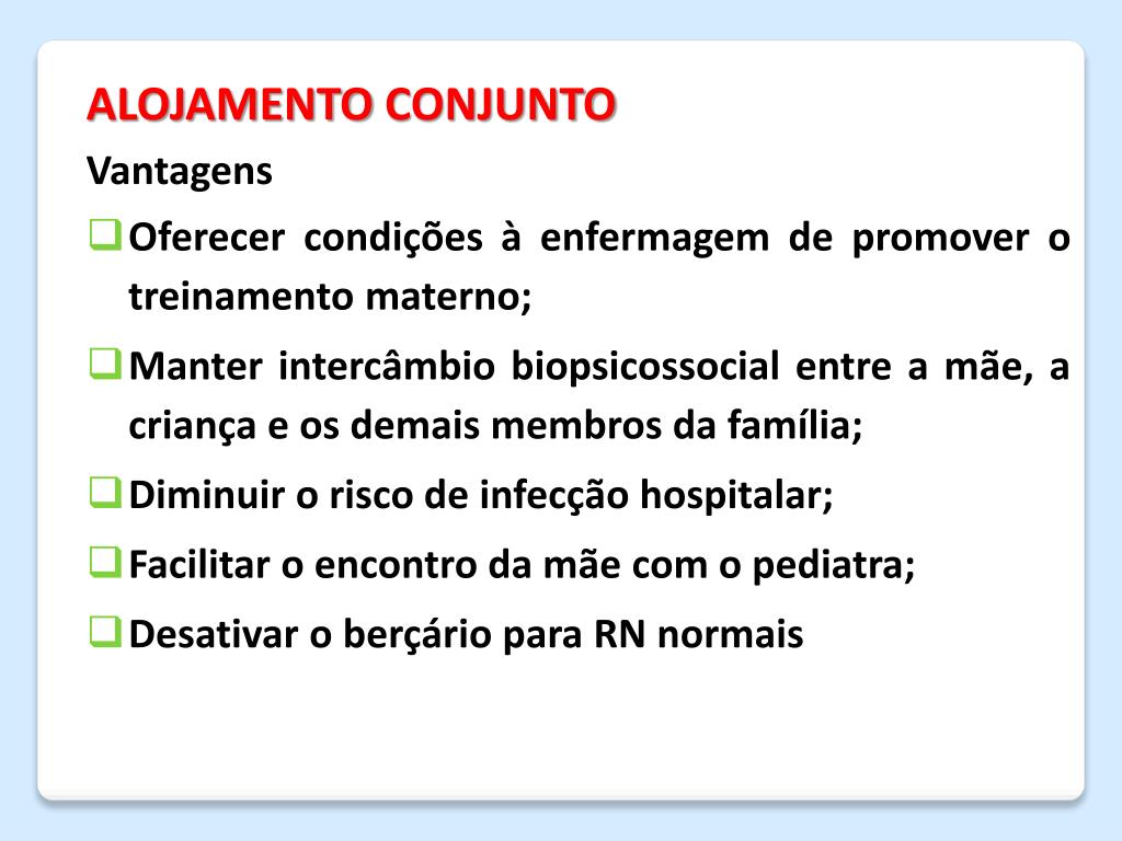ALOJAMENTO CONJUNTO • Vantagens • Oferecer condições à enfermagem de promover o treinamento materno; • Manter intercâmbio biopsicossocial entre a mãe, a criança e os demais membros da família; • Diminuir o risco de infecção hospitalar; • Facilitar o encontro da mãe com o pediatra; • Desativar o berçário para RN normais