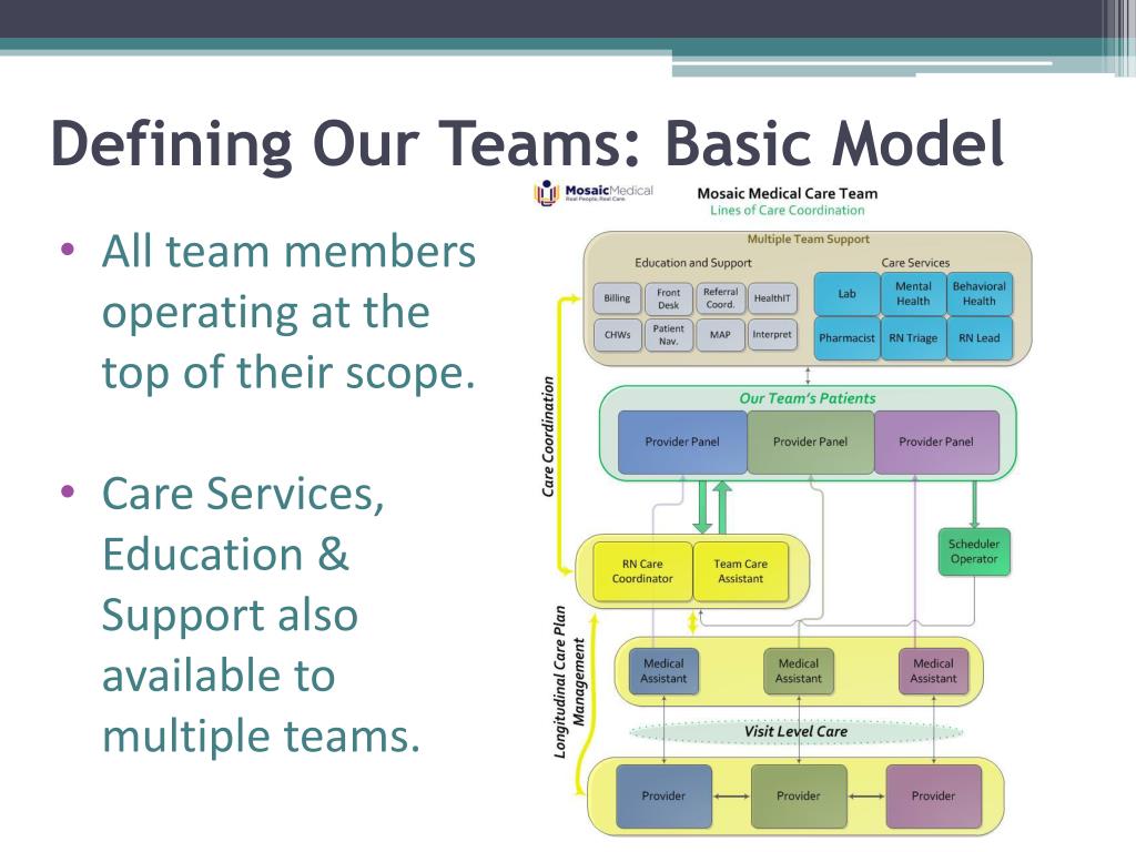 Defining Our Teams: Basic Model • All team members operating at the top of their scope. • Care Services, Education & Support also available to multiple teams.