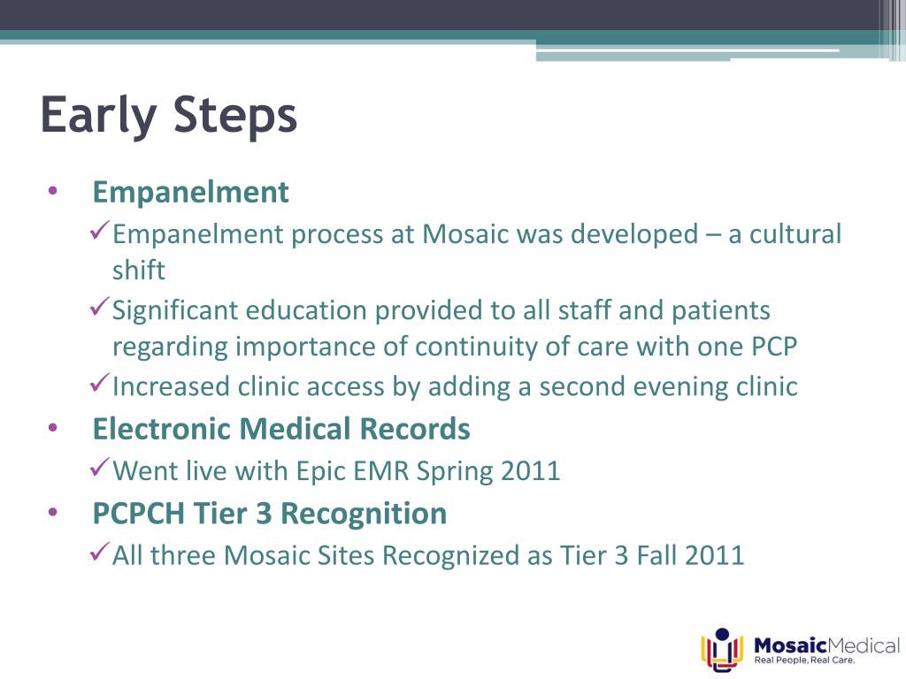 Early Steps • Empanelment • Empanelment process at Mosaic was developed – a cultural shift • Significant education provided to all staff and patients regarding importance of continuity of care with one PCP • Increased clinic access by adding a second evening clinic • Electronic Medical Records • Went live with Epic EMR Spring 2011 • PCPCH Tier 3 Recognition • All three Mosaic Sites Recognized as Tier 3 Fall 2011
