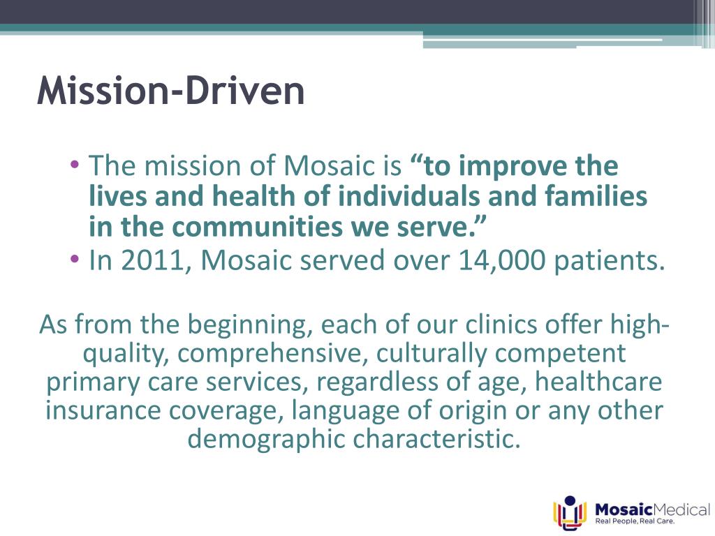 Mission-Driven • The mission of Mosaic is “to improve the lives and health of individuals and families in the communities we serve.” • In 2011, Mosaic served over 14,000 patients. As from the beginning, each of our clinics offer high-quality, comprehensive, culturally competent primary care services, regardless of age, healthcare insurance coverage, language of origin or any other demographic characteristic.