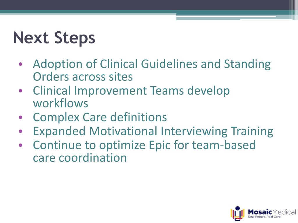 Next Steps • Adoption of Clinical Guidelines and Standing Orders across sites • Clinical Improvement Teams develop workflows • Complex Care definitions • Expanded Motivational Interviewing Training • Continue to optimize Epic for team-based care coordination
