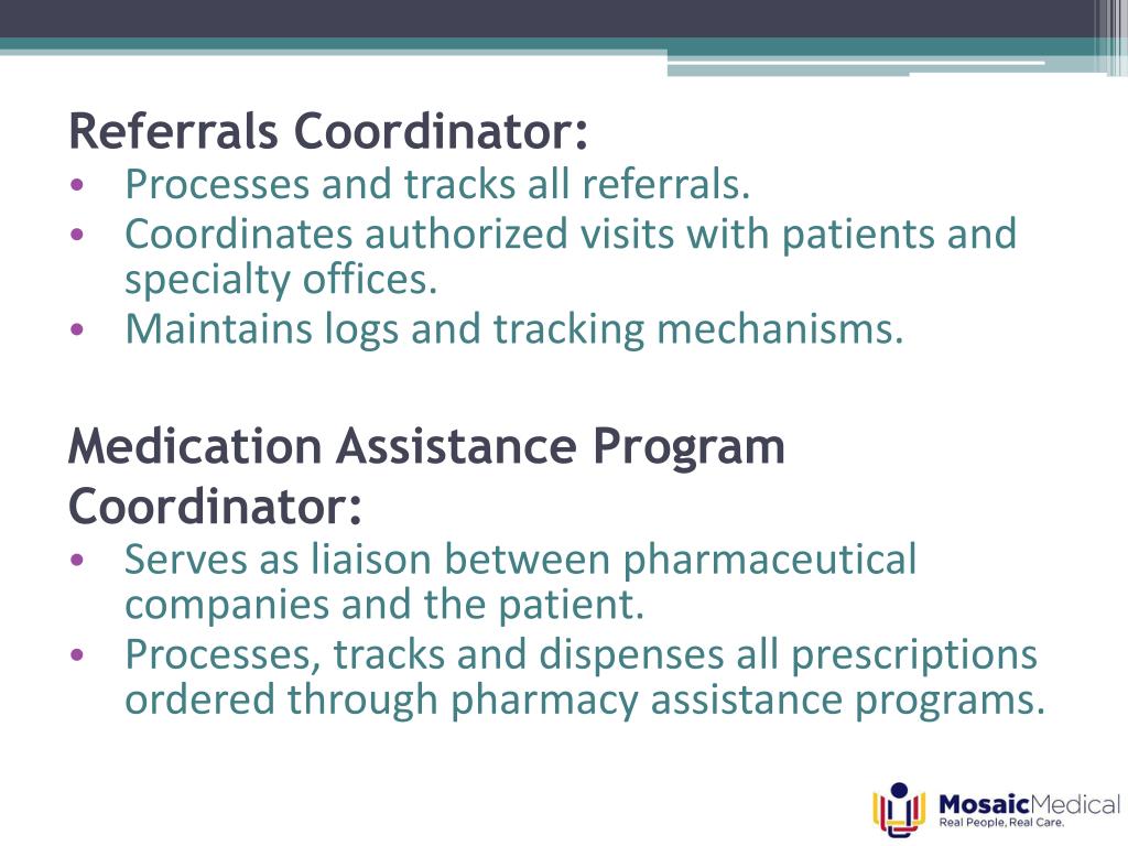 Referrals Coordinator: • Processes and tracks all referrals. • Coordinates authorized visits with patients and specialty offices. • Maintains logs and tracking mechanisms. Medication Assistance Program Coordinator: • Serves as liaison between pharmaceutical companies and the patient. • Processes, tracks and dispenses all prescriptions ordered through pharmacy assistance programs.